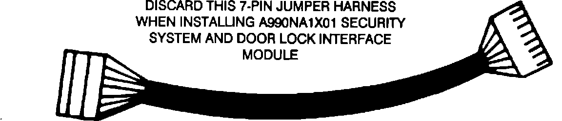 Included in the Power Door Lock Interface Module (A999NC1X01) kit is a 7 Pin jumper harness assembly. This jumper harness is not used with the new Triple Diamond Vehicle Security System (A990NA1X01) only with the old systems (A998NA1X01 and A998NA1X02). When installing the new security system AND a door lock interface module, discard the jumper harness (Figure 1). Connect the 7-pin connector from the security system module to eithet connector of the power door lock interface module.