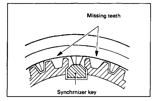 2. The synchronizer sleeve has teeth missing at six places. Assemble the hub to the sleeve so that the center tooth between the two missing teeth will touch the synchronizer key.