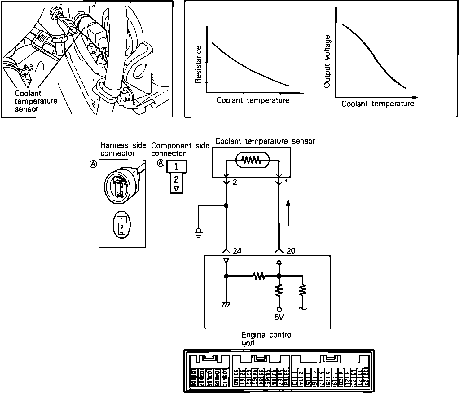 The Coolant Temperature Sensor, located in the thermostat housing, is a thermistor type sensor. As engine temperature increases, sensor resistance decreases. The ECU judges engine temperature by the sensor output voltage and provides optimum fuel enrichment when the engine is cold.