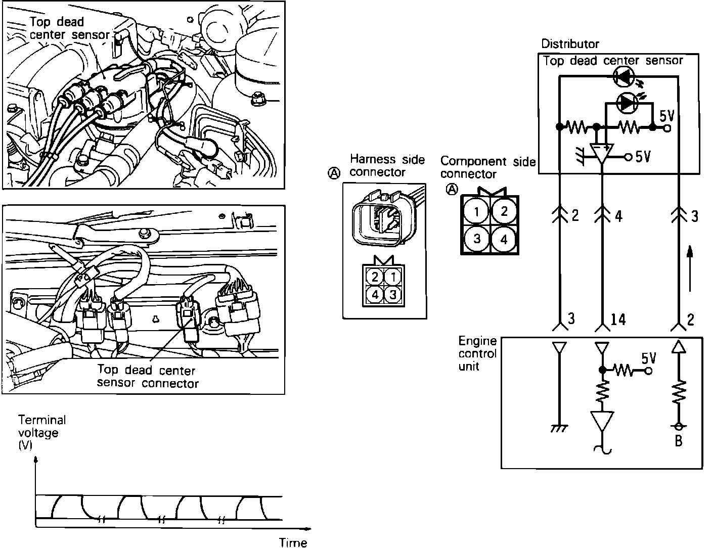 1. Connect a voltmeter between terminal 2 and 4 of the crank angle sensor connector.