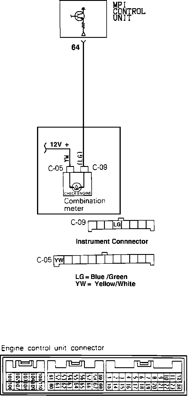 To test the Check Engine Light, located in the instrument cluster, turn the ignition switch on. The light should illuminate. This insures that the light is operative. If the light bulb does not illuminate the most likely fault is a defective light bulb. If the light tests good the other possible causes are, the ECU not supplying ground at terminal 64, the wiring harness or instrument cluster printed circuit board (refer to ELECTRICAL AND ELECTRONIC DIAGRAMS).