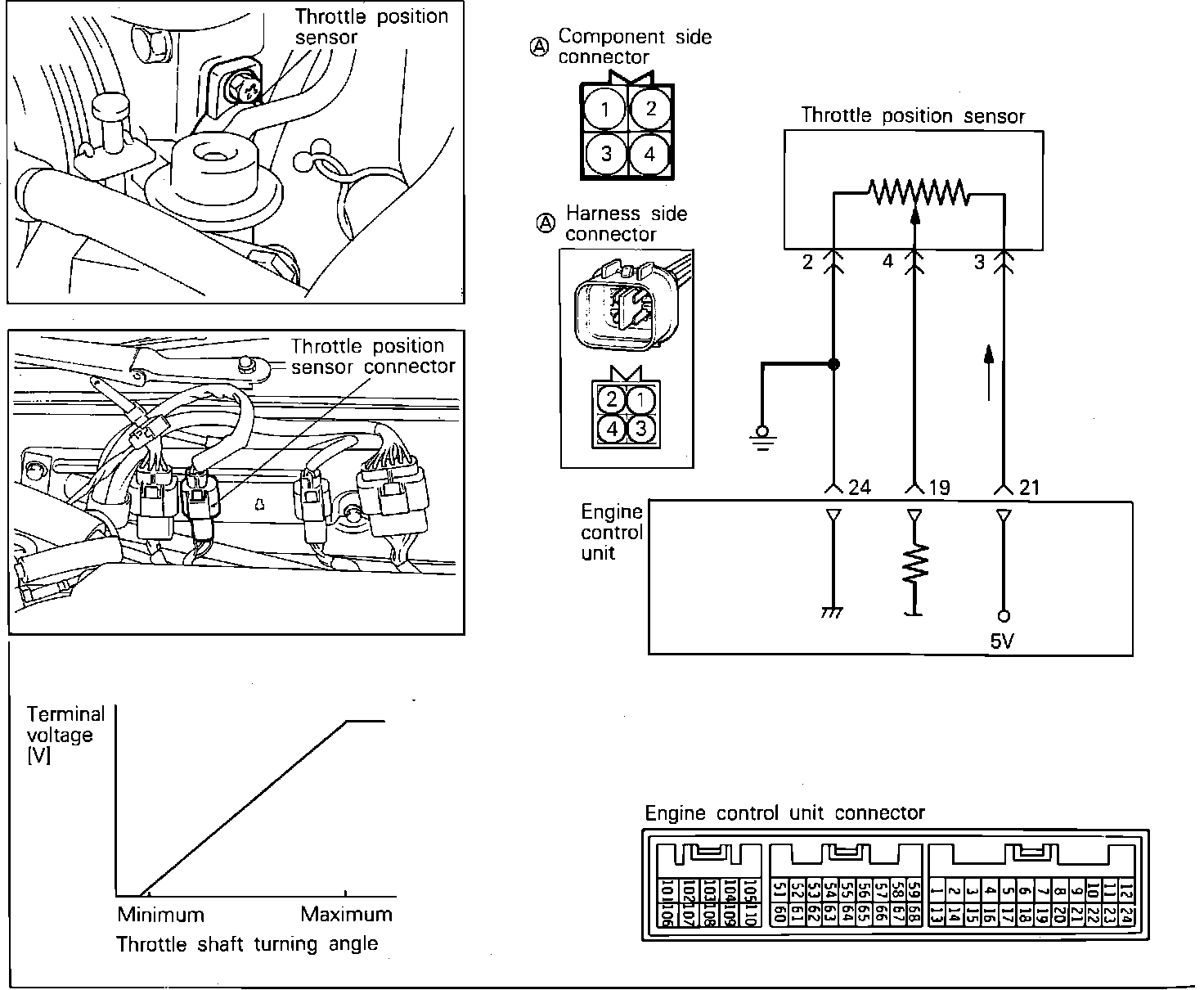 2. Using a high-impedance digital voltmeter, carefully back probe the throttle position connector into terminals #2 and #4. Refer to the connector in the image.