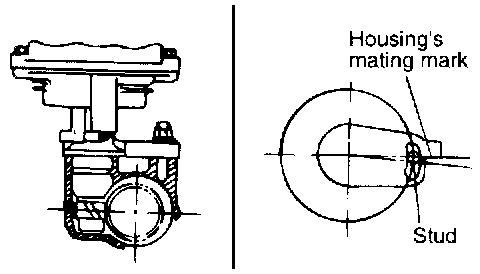 3. Install the distributor to the engine while aligning the fine cut (groove) on the distributor's installation flange with the center of the distributor installation stud.