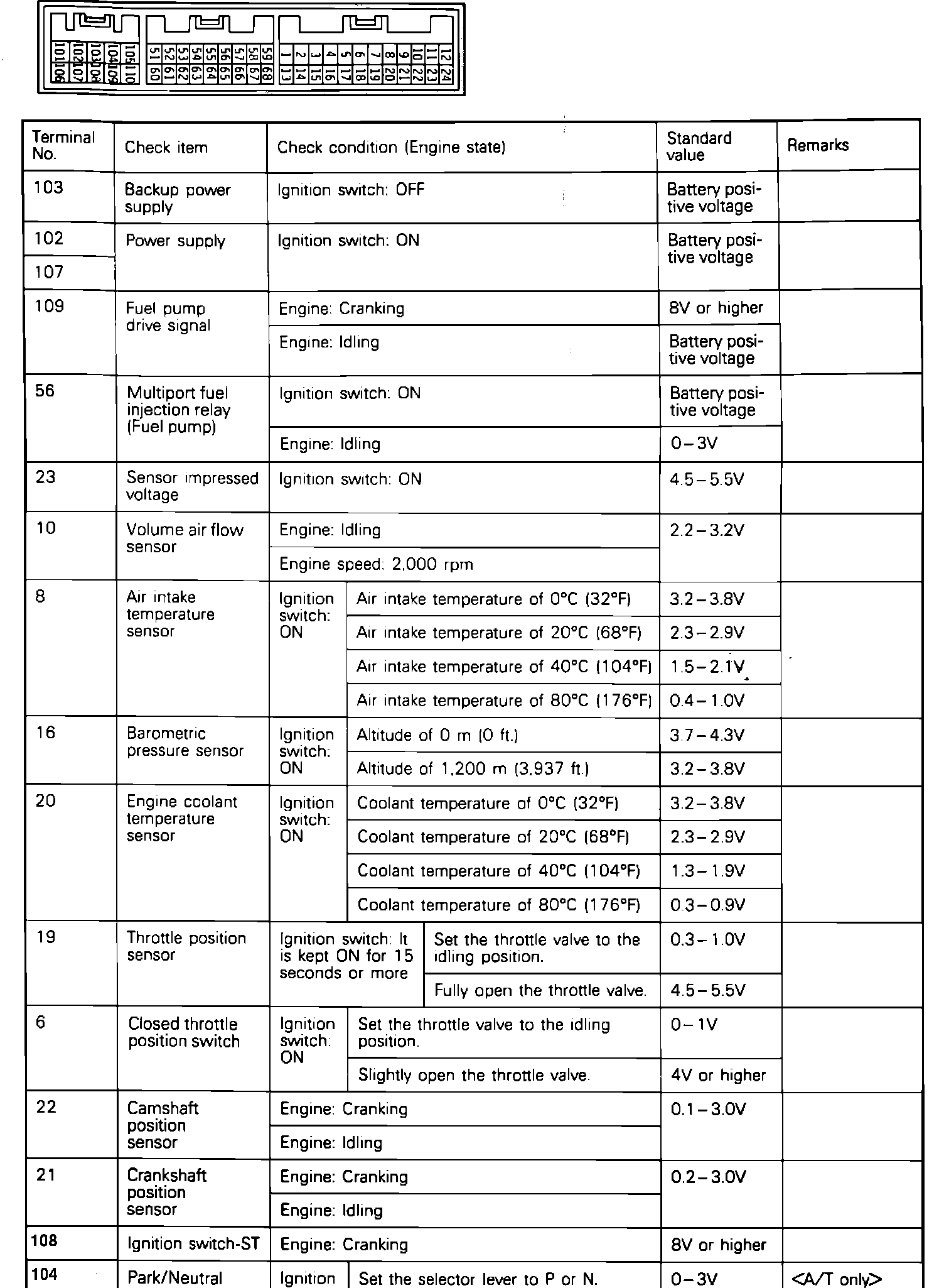 NOTE: Before replacing a ECU that is found to be faulty, insure that no other condition exists that will damage the new unit. This can be best done by testing the inputs and outputs to the ECU for over Voltage/inappropriate power readings or grounds. Use the terminal Voltage chart image and the individual component testing procedures to identify the correct readings for each pin. Check all pins (at the harness with the ECU removed) that supply a signal to the ECU, for their correct readings and check all other pins to insure that there are no uncalled for Voltage readings or grounds present.