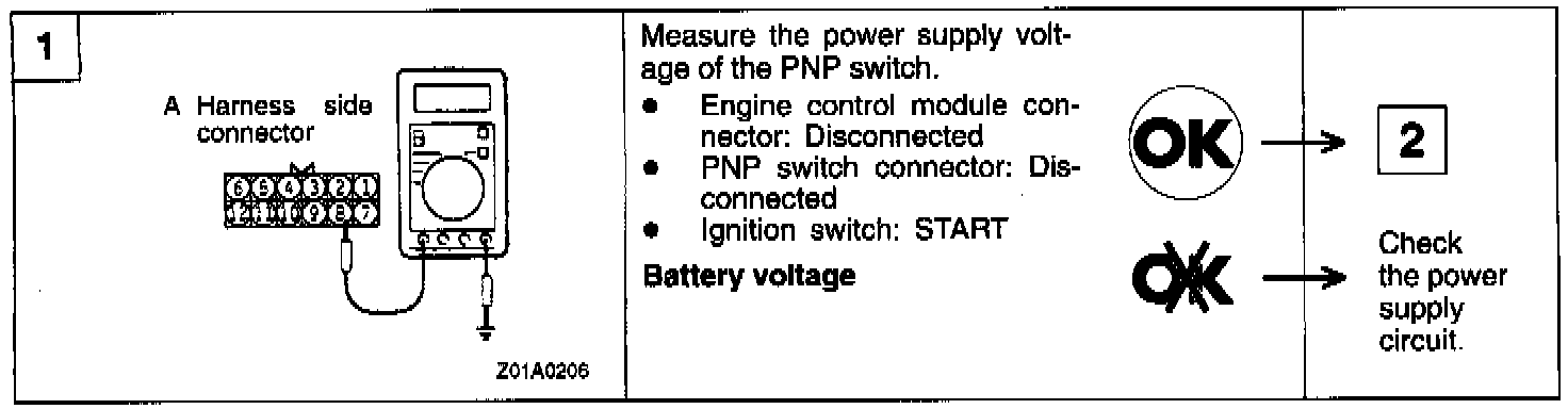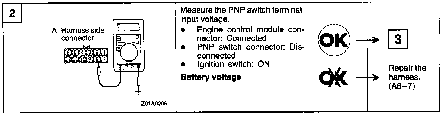 Hint: If the park/neutral position switch harness and individual part checked good but the park/neutral position switch output is abnormal, poorly adjusted control cable is suspected.