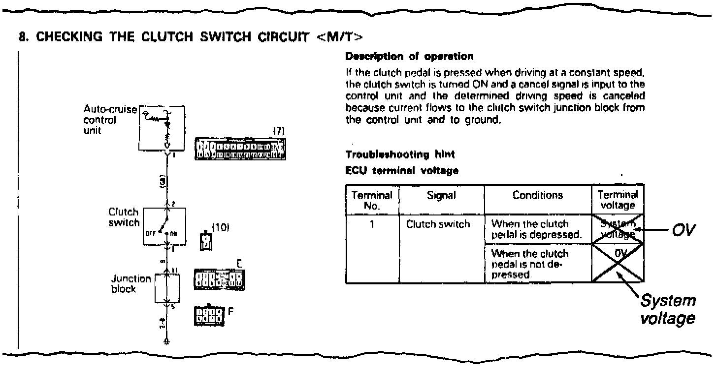 This Technical Service 8ulletin corrects the clutch switch terminal voltages shown in the Auto-Cruise Control System section of the service manual. As a reference to this bulletin, write the TSB revision number in the TSB revision box located near the bottom of each affected service manual page.