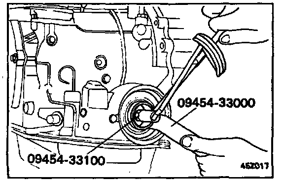 5. While holding with the special tool (09454-33000) so that the kickdown servo piston won't turn, use a socket wrench (09454-33100) to "tighten", the adjustment screw to 10 Nm (7.2 Ib.ft). Loosen and tighten the adjustment screw two times, and then re-torque to 5 Nm (3.6 lb.ft). Back-off the adjustment screw 2 to 2-18/4 turns.