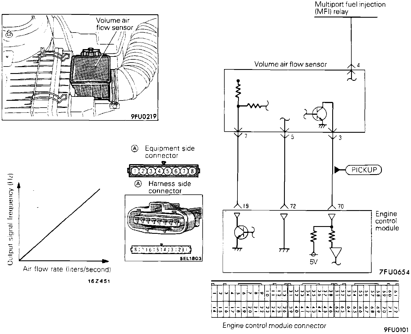 NOTE: If the air flow sensor fails, the intake air volume cannot be measured and as a result, normal fuel injection control is no longer available. However, the vehicle will run using the pre-programmed value.