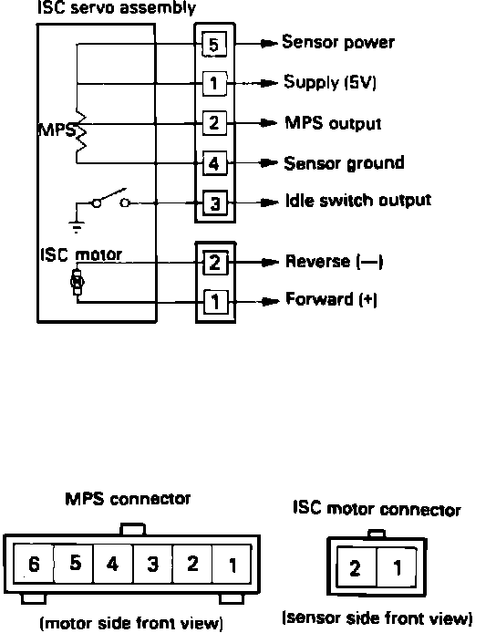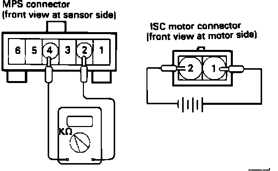 4. Connect a 6V battery between terminals 1 and 2 of the ISC motor connector (to operate the ISC motor) and check to see that resistance of the MPS (step #3 hook-up) changes smoothly when the ISC motor is activated.