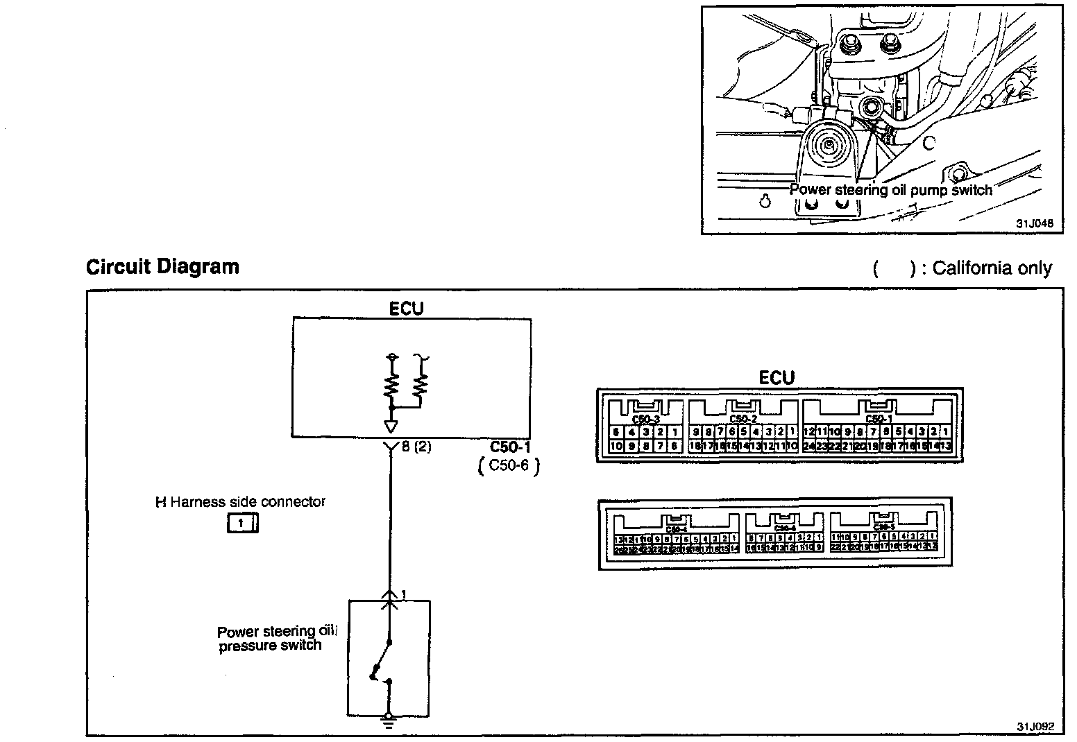 To test the Power Steering Switch remove the connector and test the terminal for ground with a continuity tester (ohm meter). With the engine running and the power steering under a load (steering wheel being turned from stop to stop) there should be a ground, with no load (steering wheel centered and stationary) there should be no ground.