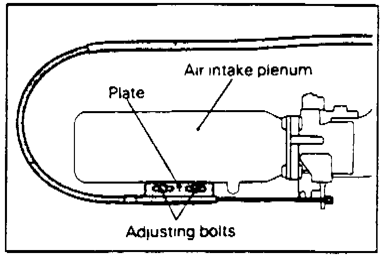 a. Loosen the adjustment bolts at the air intake plenum side and free inner cable, Fig. 8. Adjust cable to specified limits. Excessive cable deflection will cause vehicle speed to drop; excessive cable tension will cause idle speed to increase.