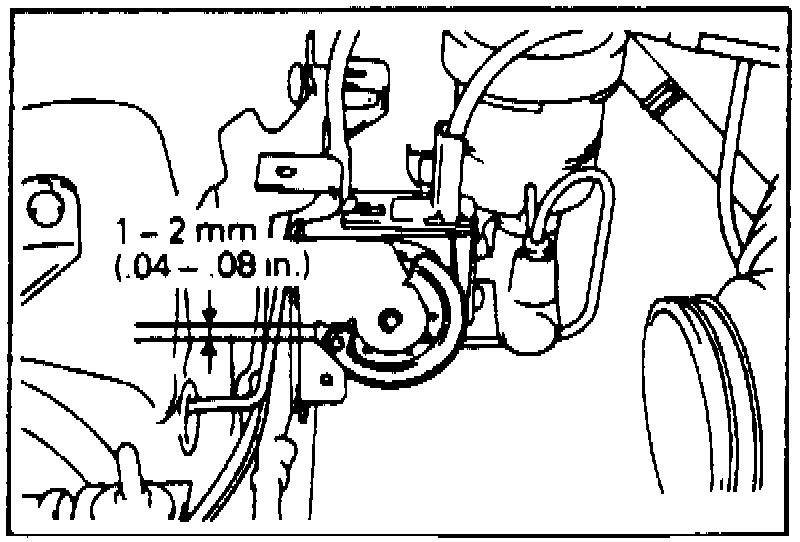 5. Check the inner cable (throttle valve side) for too much or too little slack. Cable deflection should measure 0.04-0.08 inch. If not within specified limits, adjust as follows: