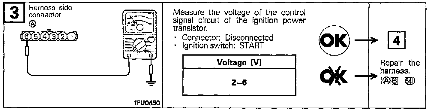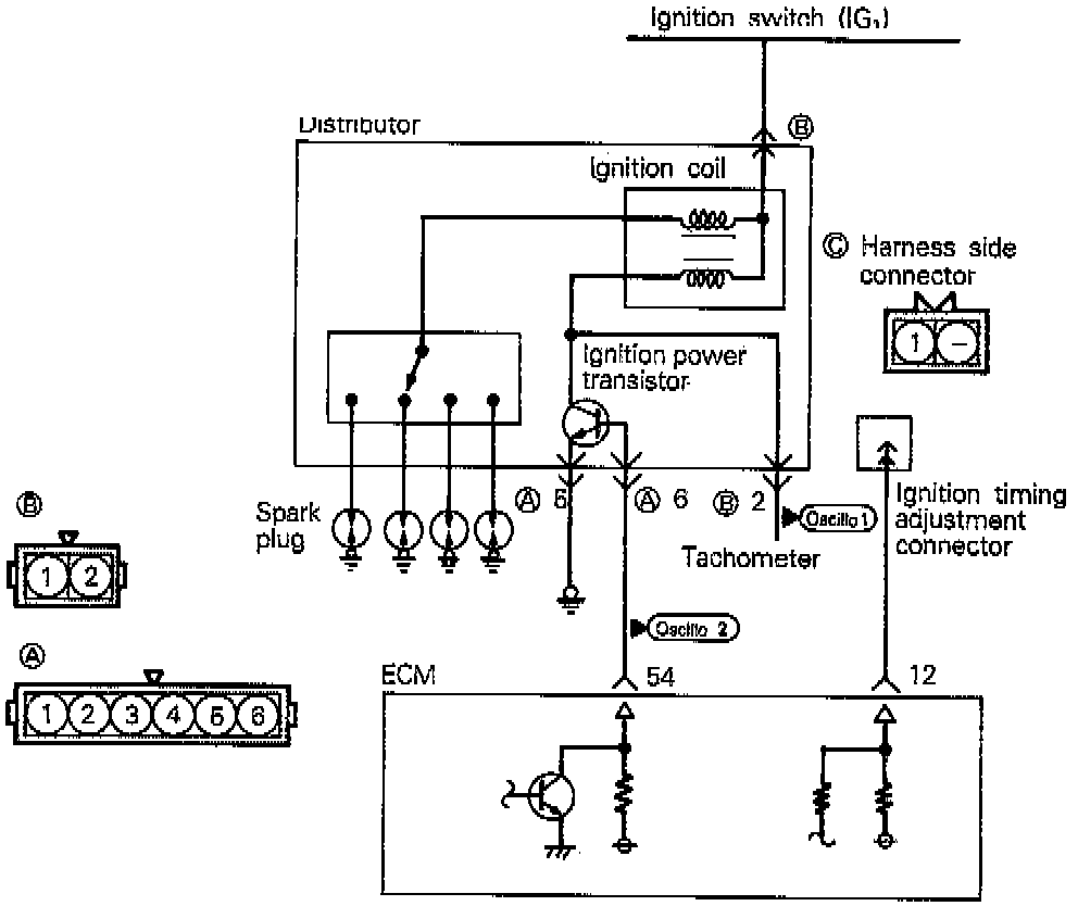 - Connect the probe to oscilloscope pick-up point 2 as shown in the circuit diagram, and check the control signal of the ignition power transistor.