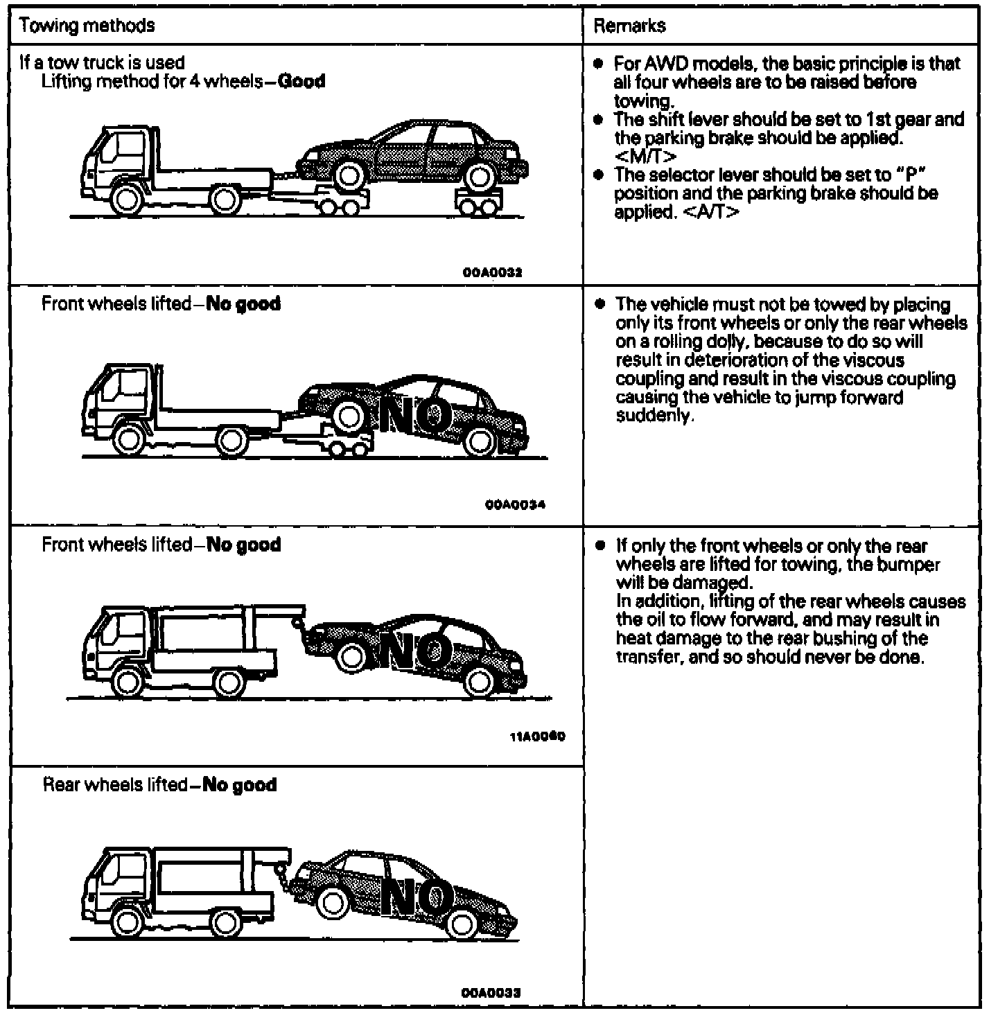 CAUTION: This vehicle cannot be towed by a wrecker using sling-type equipment to prevent the axle beam from deformation. If this vehicle is towed, use wheel lift or flat bed equipment.