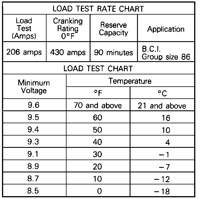 5. If the voltage is not maintained at the minimum voltage in the LOAD TEST CHART throughout the test, the battery should be replaced.