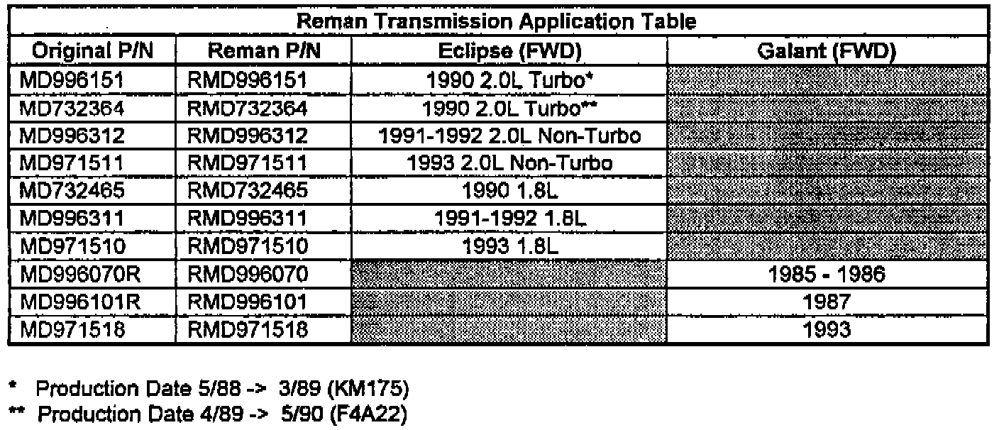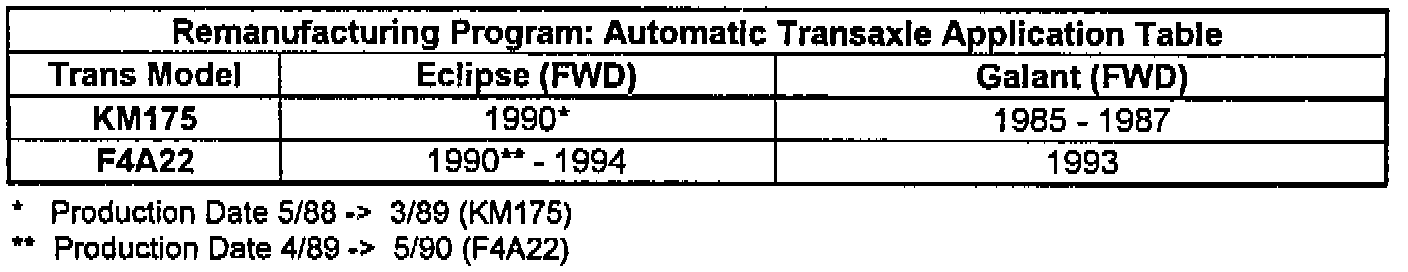 Refer to Parts Bulletin PB942311-003 for details on this reman program. For transmission diagnostic procedures for this program, refer to the MMSA Technical Training Program entitled Diagnosis for Remanufactured A/T Program.