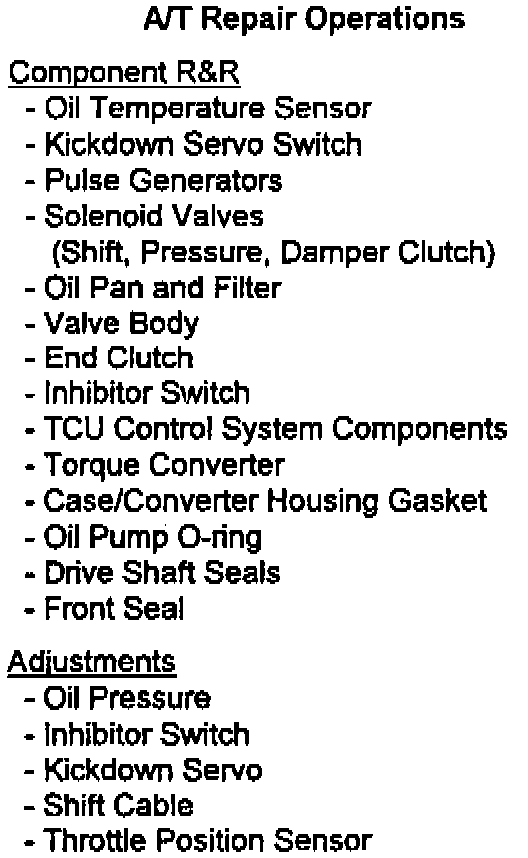 Under the remanufactured automatic transmission program, dealer repairs are limited to those shown in the adjacent table. Basically, all internal transmission repairs other than the valve body should be corrected by replacing the transmission with a remanufactured unit. Complete diagnostic procedures for transmissions in this program can be found in a new MMSA Technical Training Program entitled Diagnosis for Remanufactured A/T Program. A copy of this publication has been shipped to all Service Technicians who are registered in the Mitsubishi Tech Team Program. This publication provides diagnostic trouble charts that supersede the ones in the service manual. It also supersedes the previous publication entitled KM175 Diagnosis and Repair.