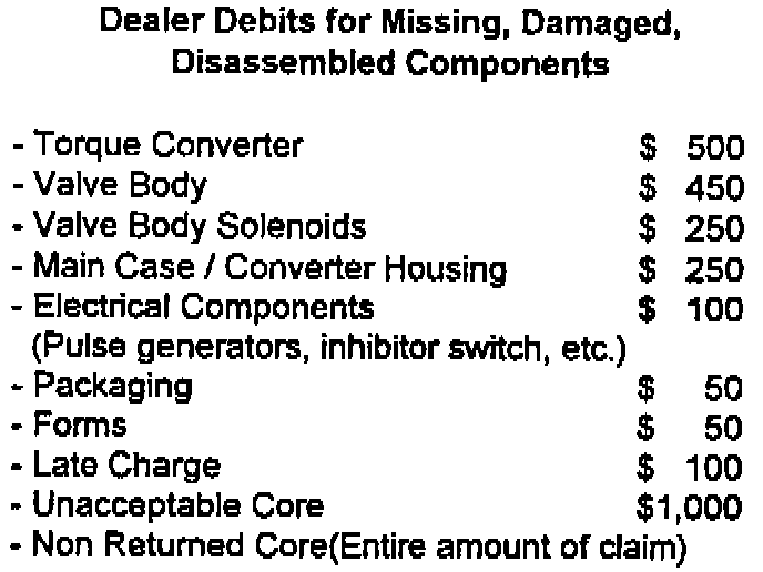 5. Ensure all components are returned and attached properly to the transmission e.g. dipstick, dipstick tube, inhibitor switch, pulse generators, etc. Transmissions received at the remanufacturing facility with missing and/or disassembled components will result in a warranty claim debit to the dealer. The adjacent list contains the debit amounts that will be incurred if the transmission is not returned properly.