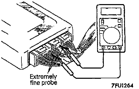 2. At each terminal of the engine control module connector, insert the extremely fine probe from the wire side and measure the Voltage referring to the check chart.