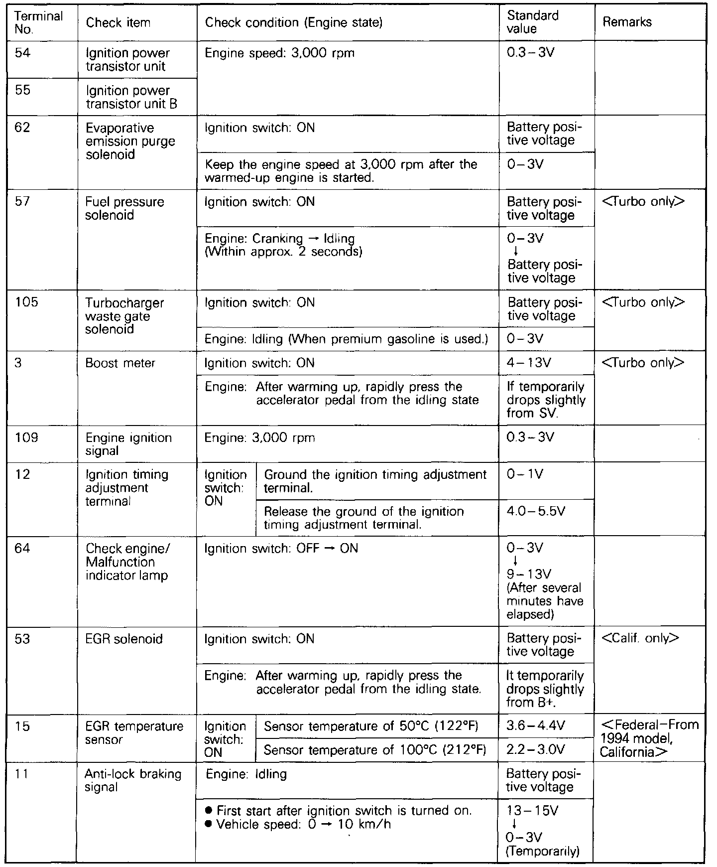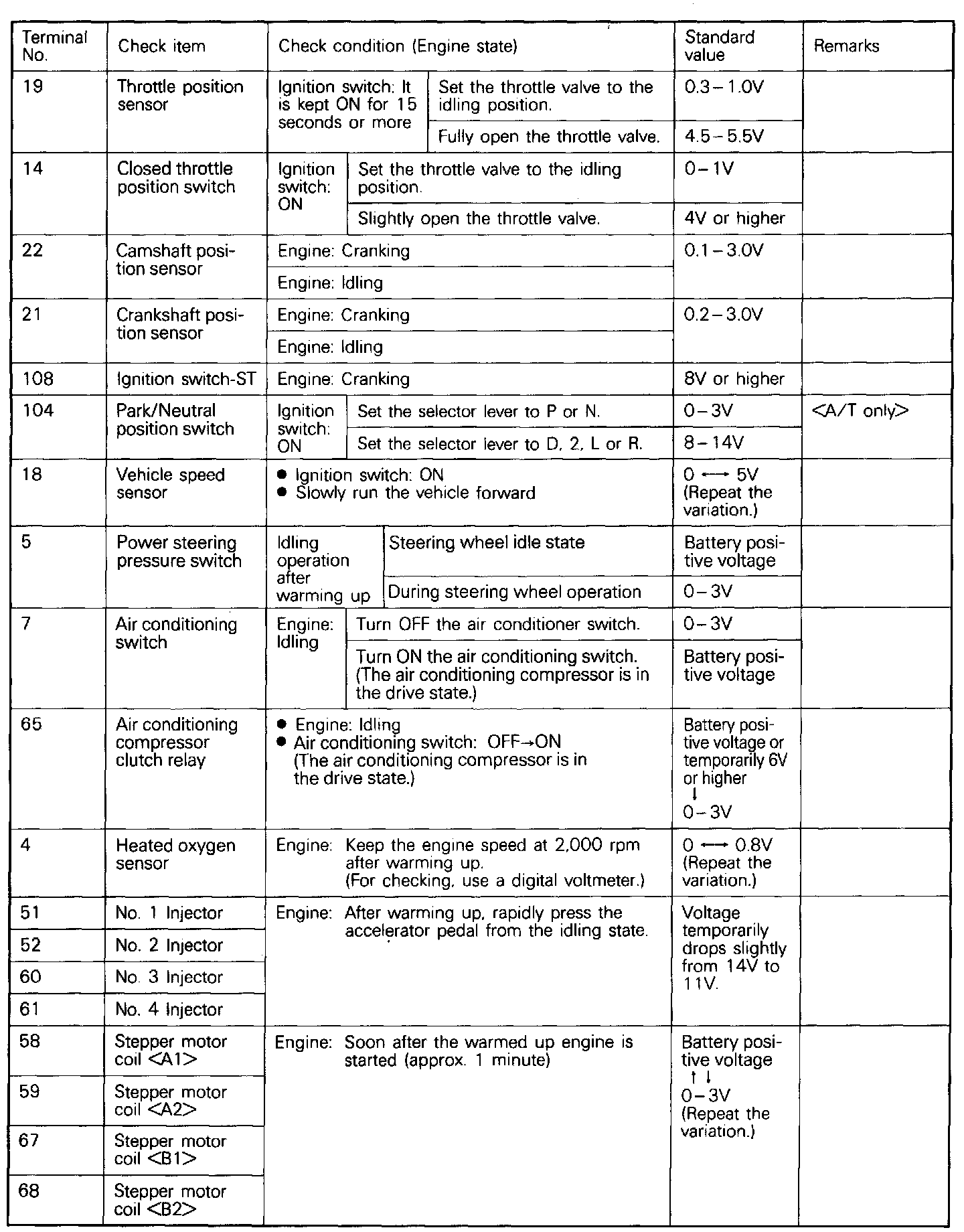 Note: In the state in which the connector of the engine control module is connected, measure the Voltage. Measure the Voltage across each terminal to the terminal # 106 (ground terminal). You may find it convenient to pull out the engine control module to make it easier to reach the connector terminals. Inspection need not be executed in the chart's sequence.