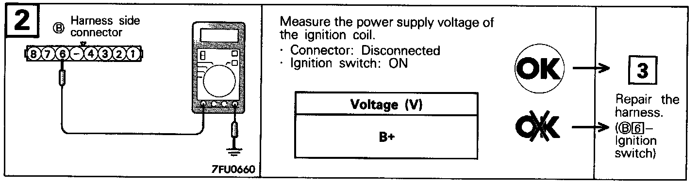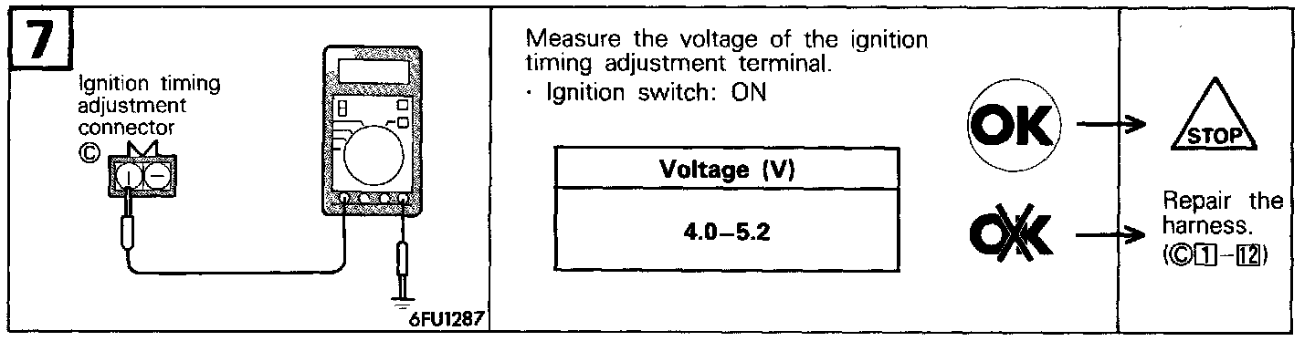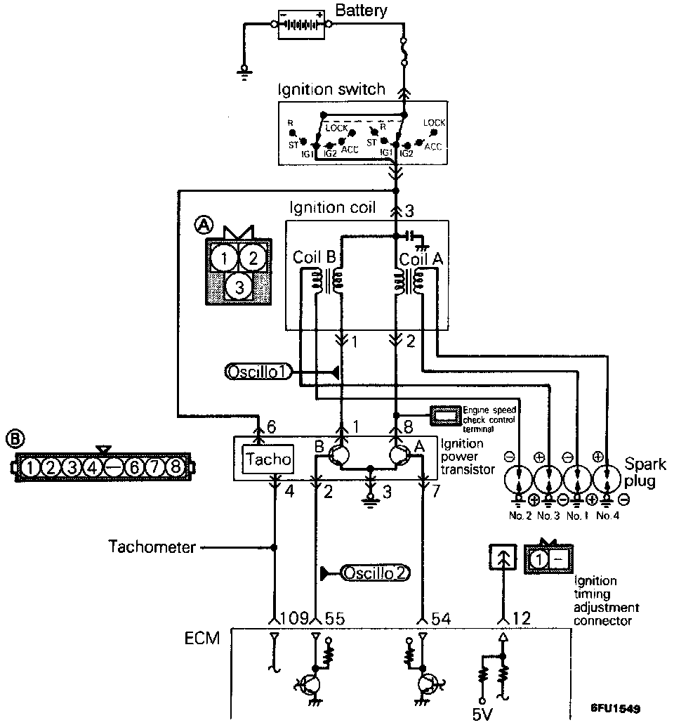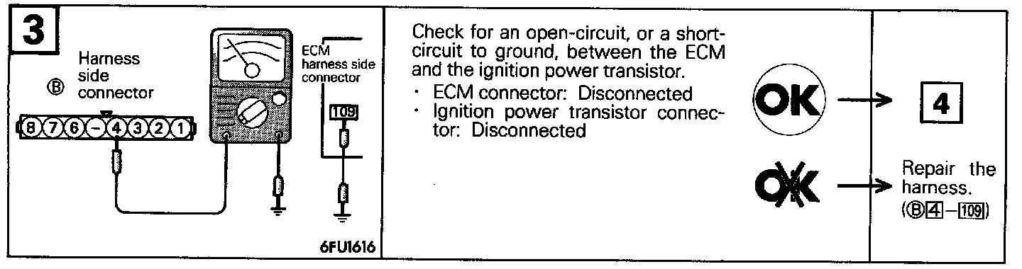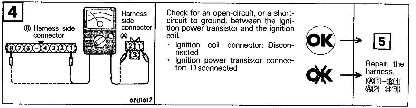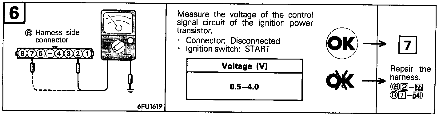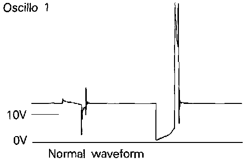 Connect the probe to oscilloscope pick-up point 2 as shown in the circuit diagram, and check the control signal of the ignition power transistor.
