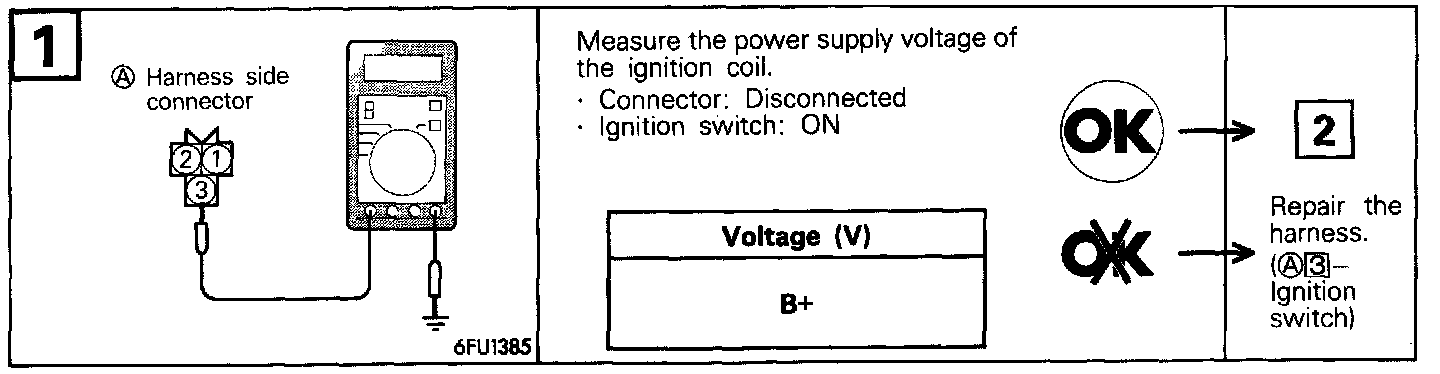 - Connect the probe to oscilloscope pick-up point 1 as shown in the circuit diagram, and check the primary signal of the ignition coil.