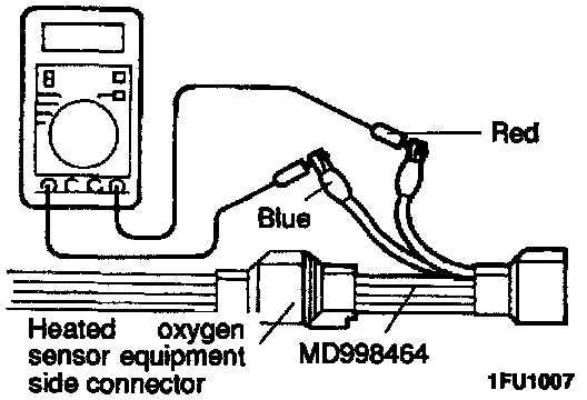2. Make sure that there is continuity [Approx. 12 Ohms at 20°C (68°F)] between terminal 2 (red clip of special tool) and terminal 4 (blue clip of special tool) on the heated oxygen sensor connector.