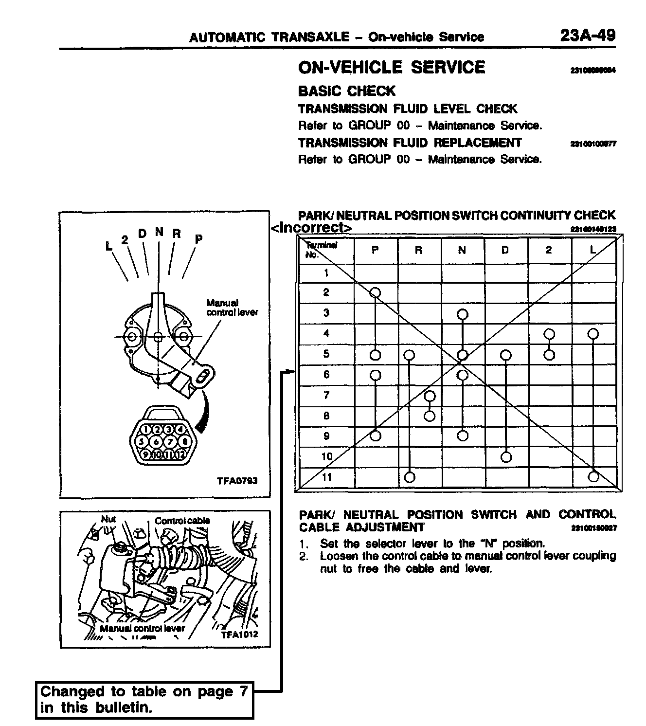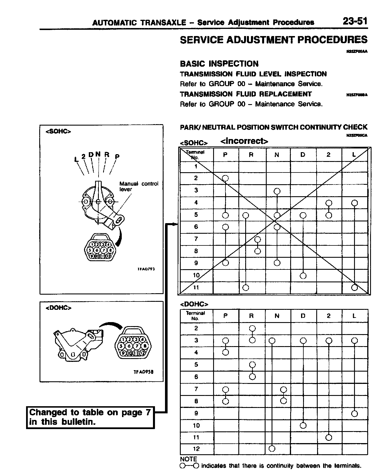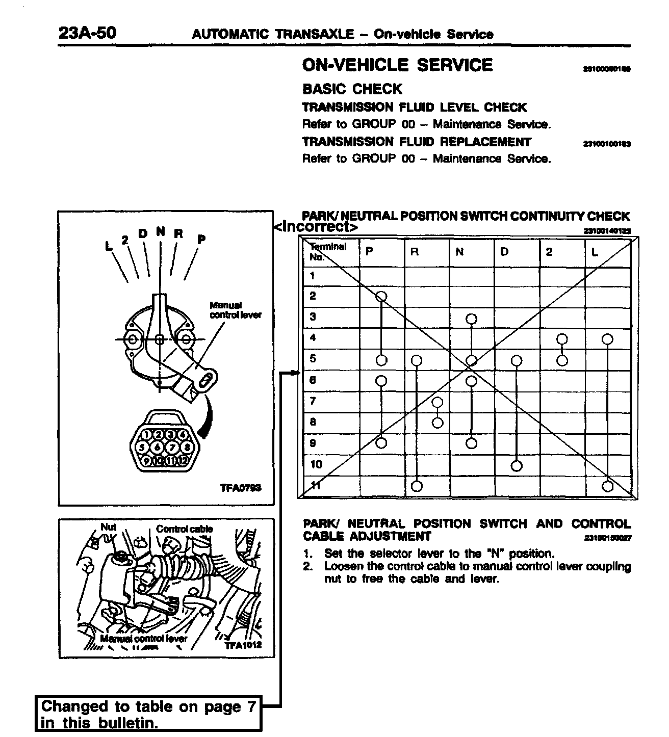 PARK/NEUTRAL POSITION SWITCH CONTINUITY CHECK - SERVICE MANUAL REVISION