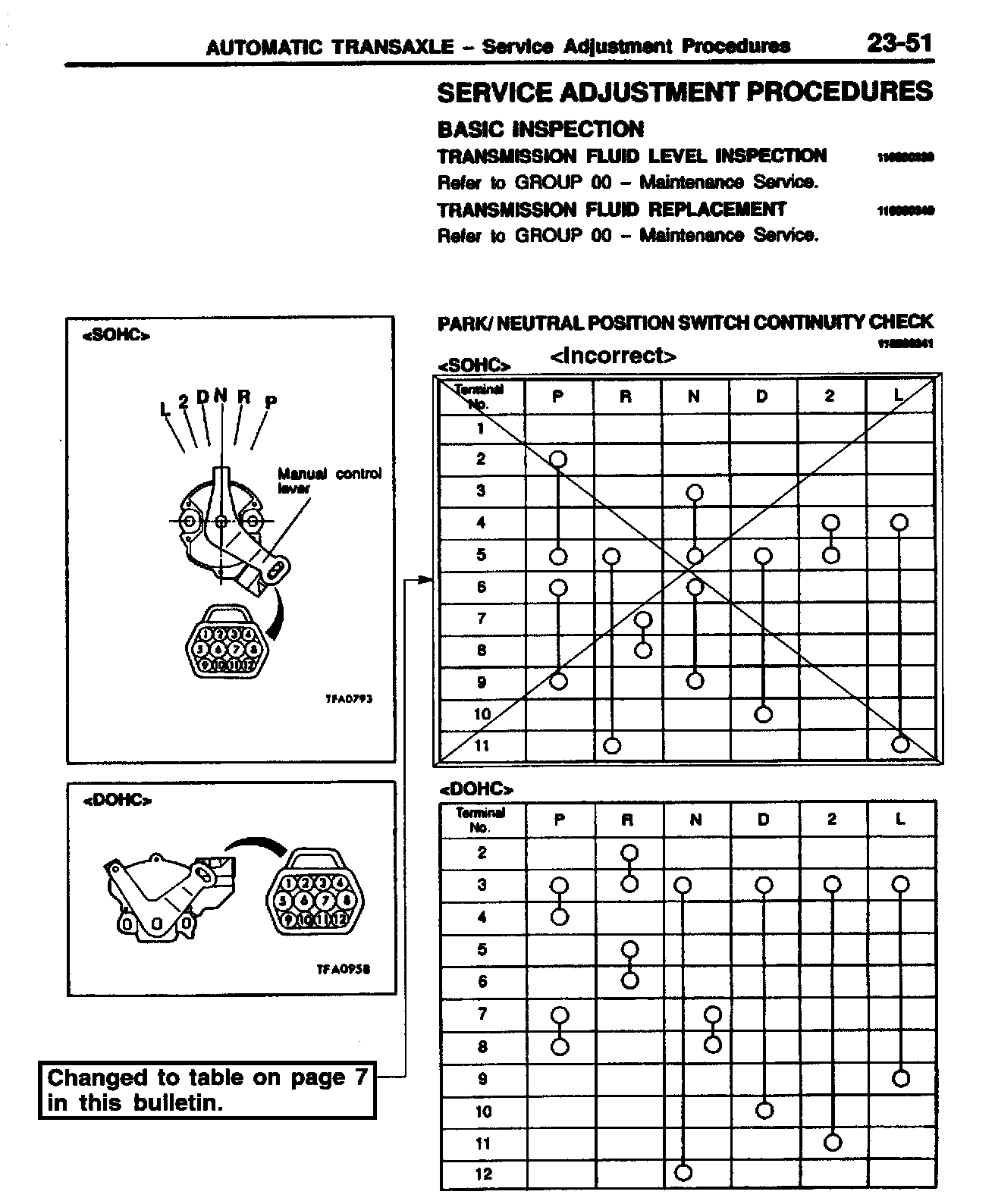 The park/neutral position switch continuity check table is incorrectly printed in the affected service manual pages. This bulletin contains the corrected continuity chart.