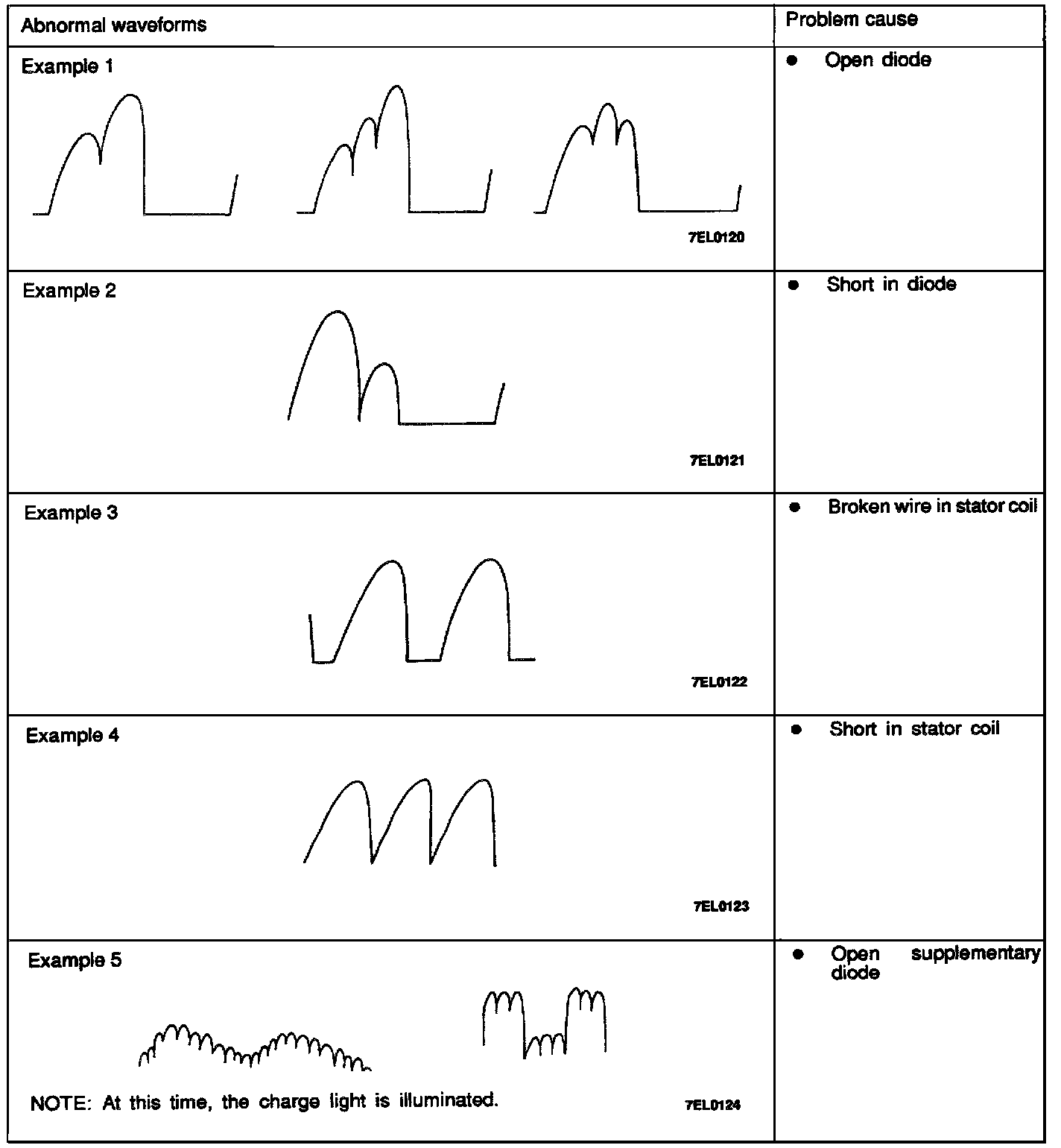 2. Identification of abnormal waveforms is easier when there is a large output current (regulator is not operating). (Waveforms can be observed when the headlights are illuminated.)