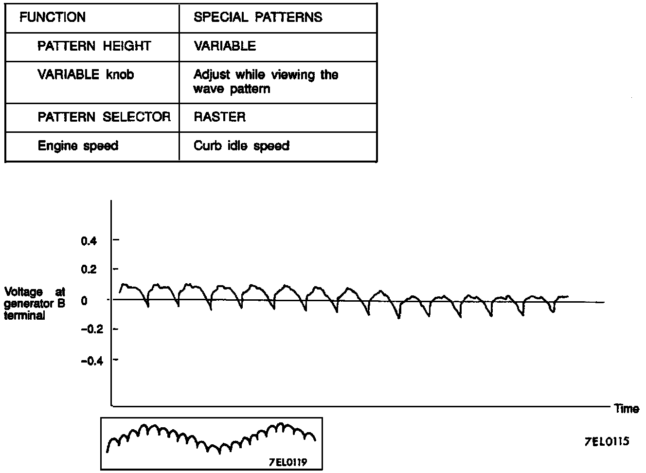 NOTE: Furthermore, the voltage waveform of the generator B terminal can undulate as shown. This waveform is produced when the regulator operates according to fluctuations in the generator load (current), and is normal for the generator.