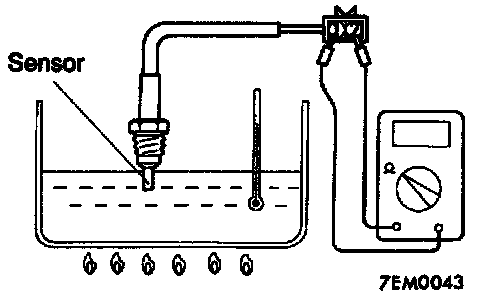2. Place the EGR temperature sensor in water, and then measure the resistance value between terminals 1 and 2 while increasing the water's temperature. Replace the EGR temperature sensor if there is a significant deviation from the standard value.