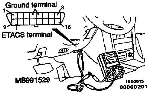 1. Use the special tool to connect a voltmeter between the ground terminal and the ETACS terminal of data link connector.