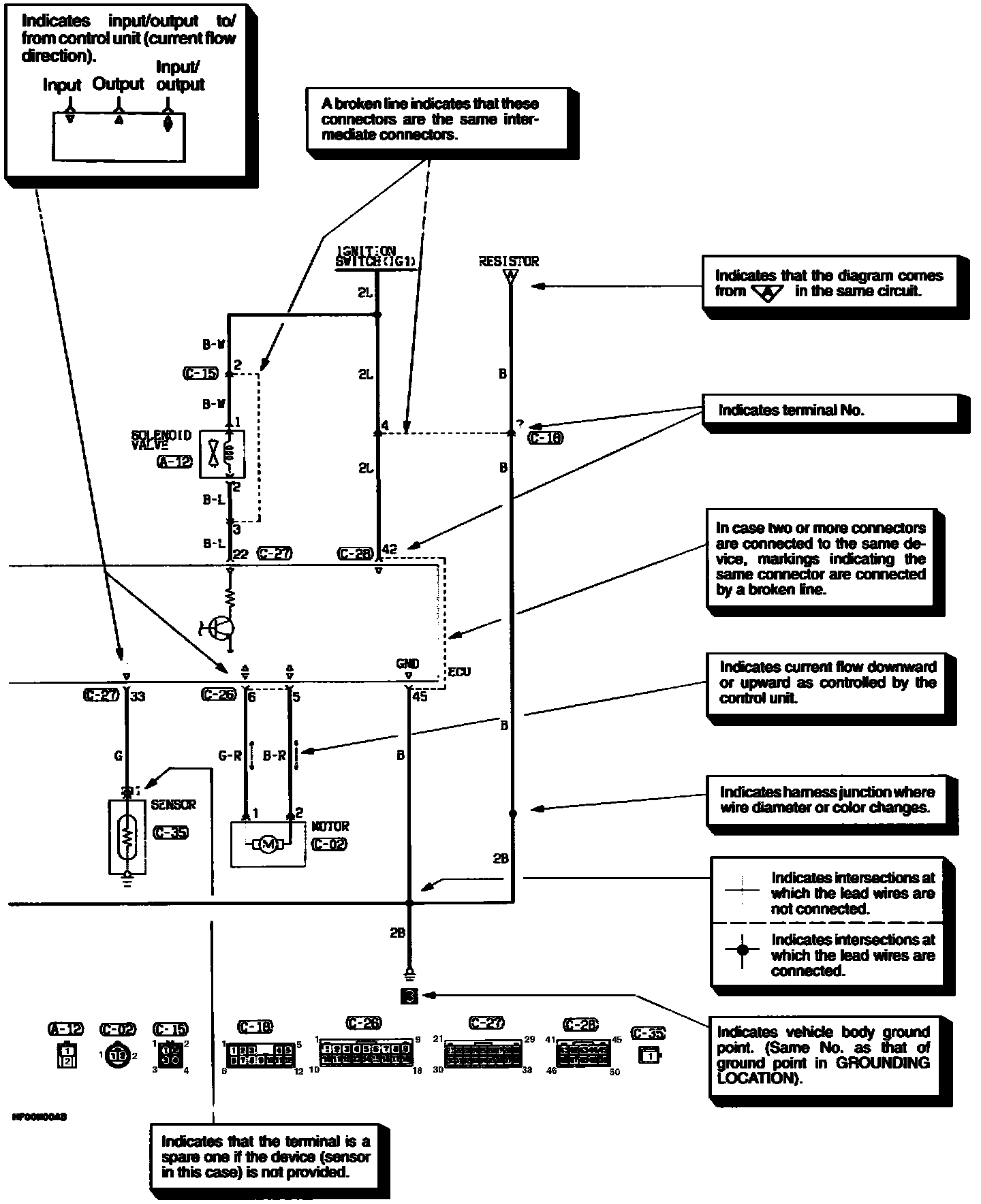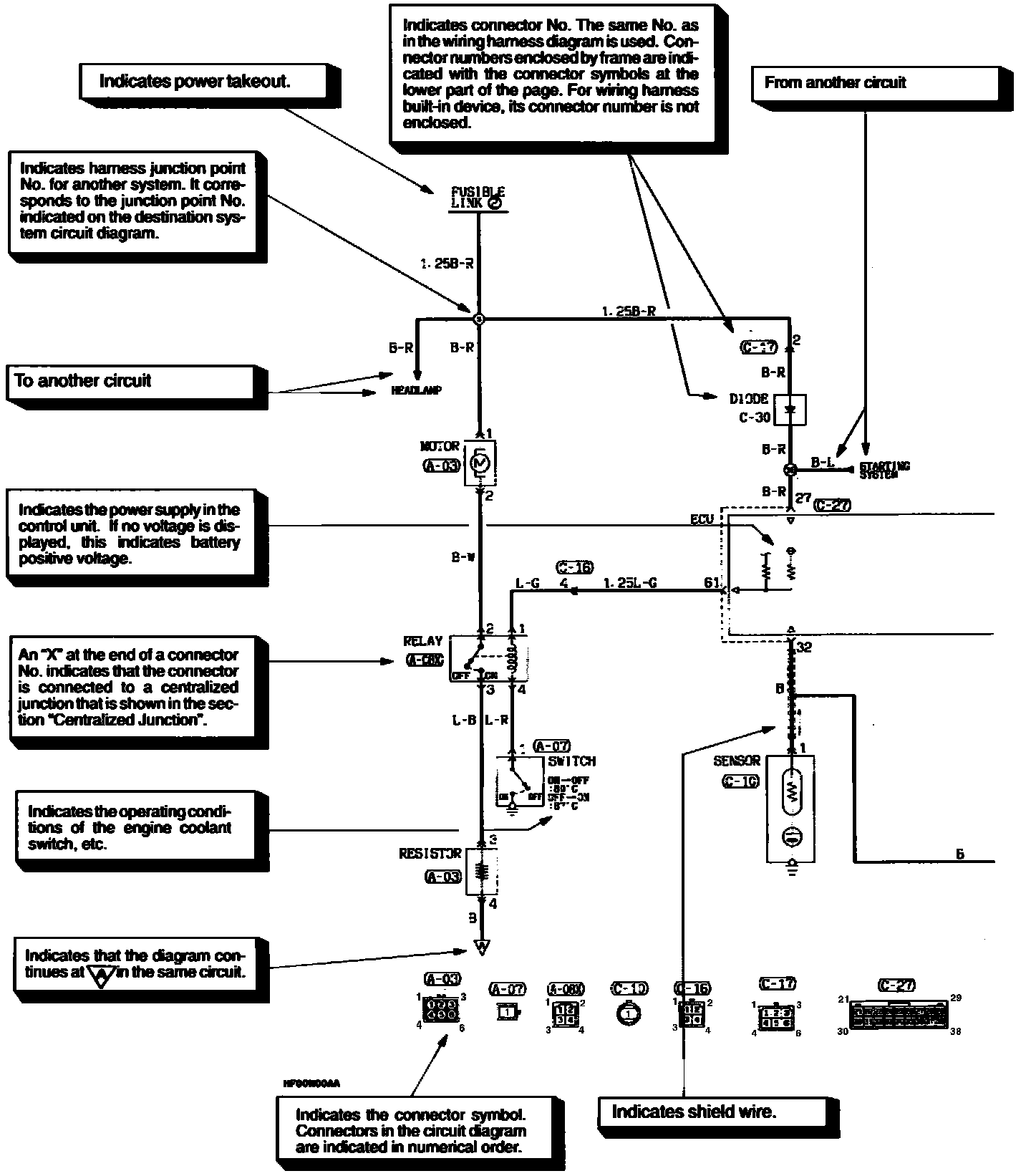The circuit of each system from the fuse (or fusible link) to ground is shown. The power supply is shown at the top and the ground at the bottom to facilitate understanding of how the current flows.