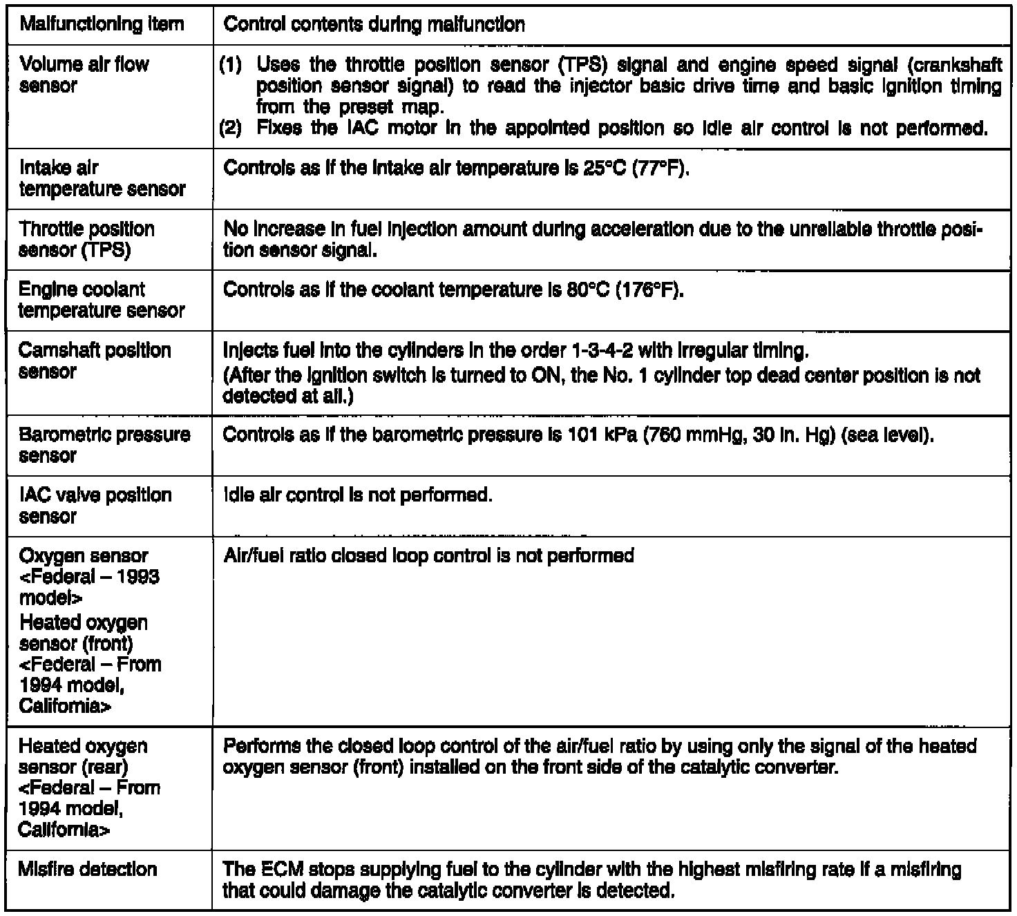 When the main sensor malfunctions are detected by the on-board diagnostics, the vehicle is controlled by means of the following defaults.