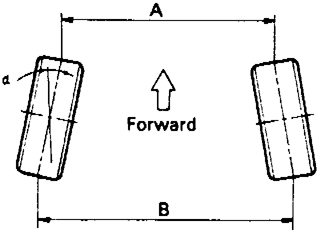 As viewed from above, wheels must be set so distances A and B, Fig. 3, measured at wheel rims and at axle height, are different at a given value. If distance A is smaller than distance B, setting is known as toe-in. If distance A is greater than distance B, setting is known as toe-out. toe setting is given in inches and refers to difference between A and B. If distances A and B are same, toe setting is 0.