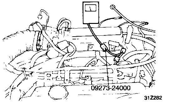 2. Install the tachometer (Disconnect the noise filter connectors and connect the Special Service Tool [09273-24000] between them. Then, connect the tachometer to the Special Service Tool) and the timing light, or connect the scan tool to the Data Link Connector in the fuse box.