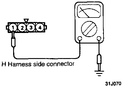 3. Connect a pointer type ohmmeter between terminal 1 (sensor ground) and terminal 3 (sensor output).