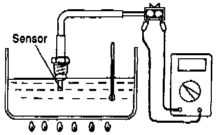 1. Place the Exhaust Gas Temperature Sensor in water and then measure the resistance value between terminals 1 and 2 while increasing the water temperature. Verify the following specifications;