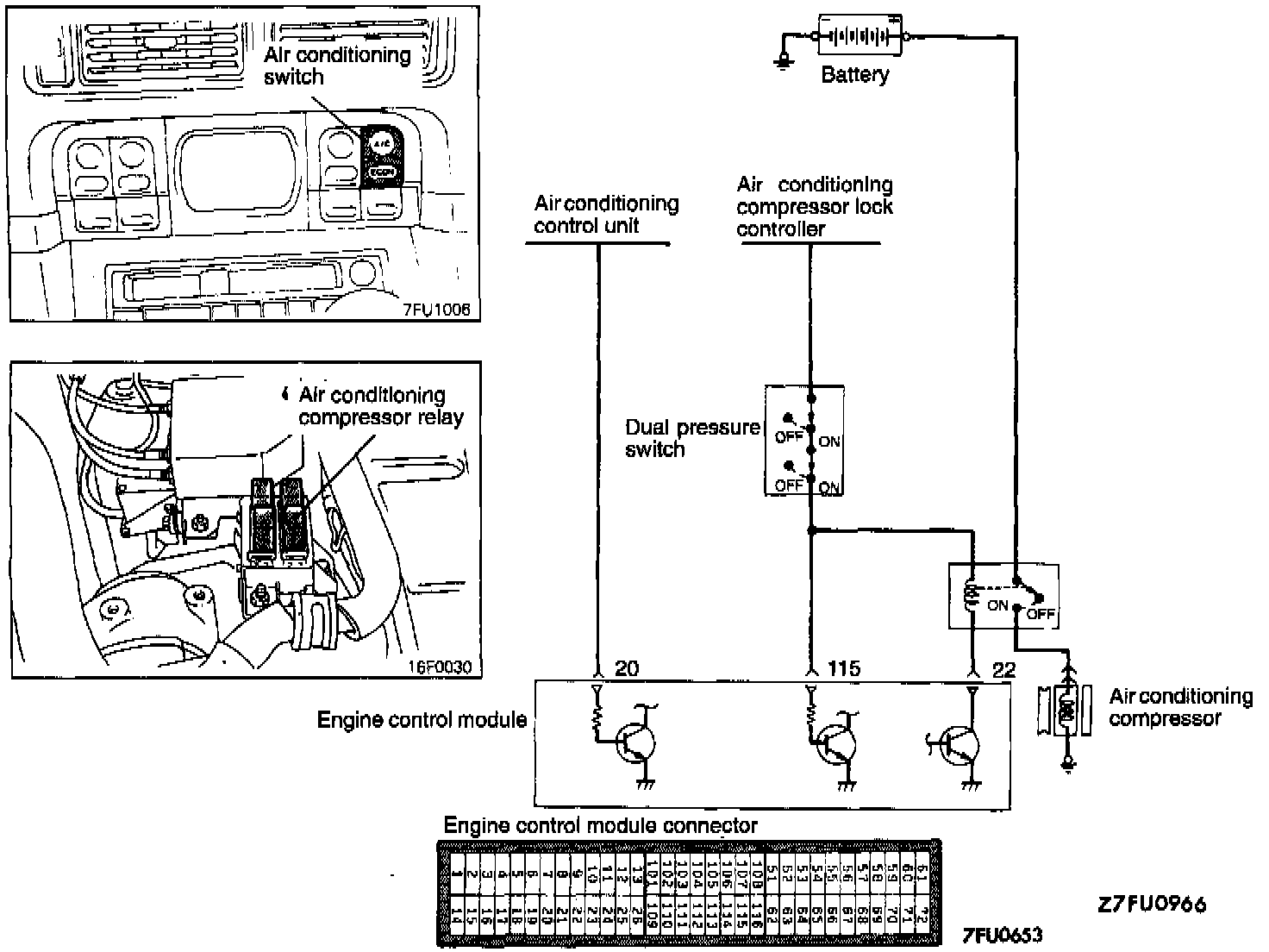 Hint: If the air compressor magnet clutch is not activated when the air conditioning switch is turned on during idling, faulty air conditioning control system is suspected.