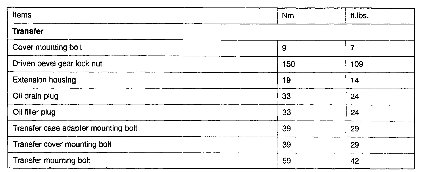 F5M31/F5M33/W5M33 5-spd M/T, Transfer Case Torque: