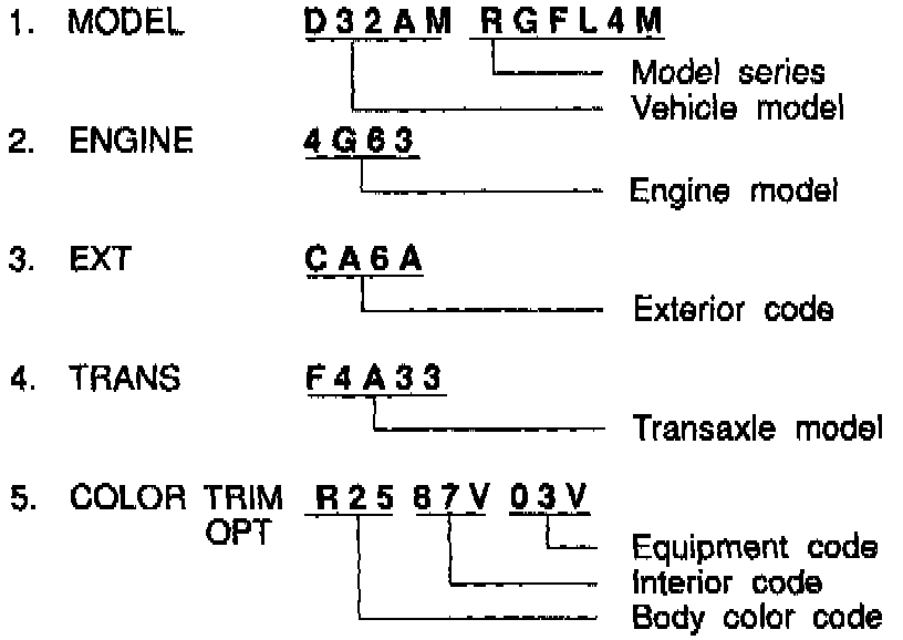 The plate shows model code, engine model, transaxle model, and body color code.