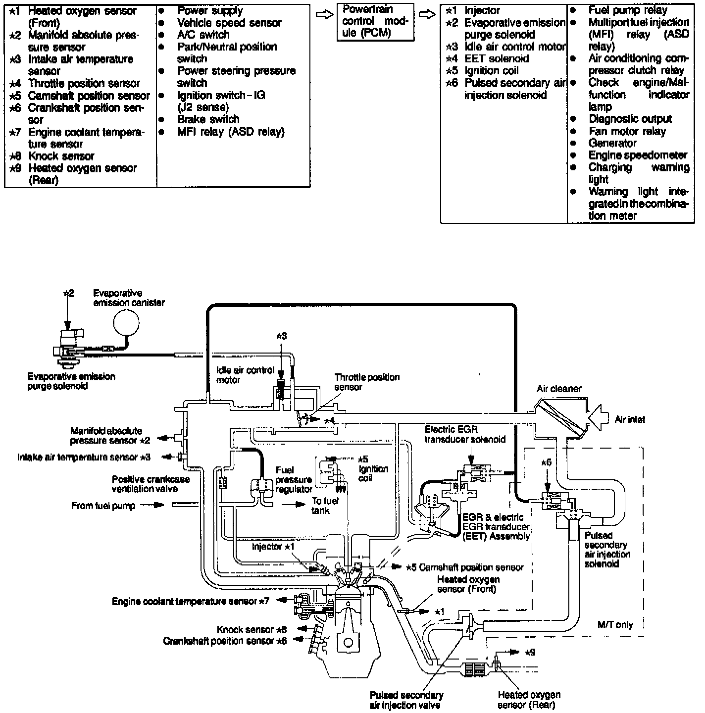 The Multiport Fuel Injection System consists of sensors which detect the engine conditions, the Powertrain Control Module (PCM) which controls the system based on signals from these sensors, and actuators which operate under the control of the PCM.The PCM carries out activities such as fuel injection control, idle air control and ignition timing control.In addition, the PCM is equipped with several diagnostic test modes which simplify troubleshooting when a problem develops.