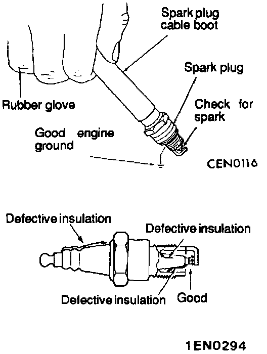 2. Ground the spark plug outer electrode (body), and crank the engine. Check for spark across the electrodes.