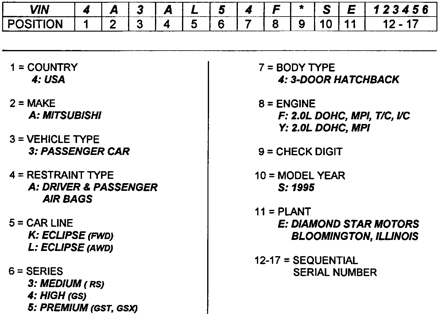 This bulletin contains information to decode the Vehicle Identification Number on the 1995 Eclipse. As additional 1995 models are released they will be covered in future Technical Service Bulletins.