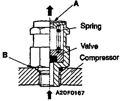 The high pressure relief valve is a safety feature which releases part of the refrigerant inside the system into the atmosphere when the high pressure level exceeds 3,740 kPa (532 psi) during air conditioning operation.