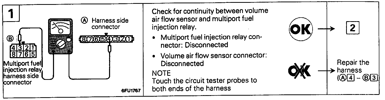 Hint 2: If the volume air flow sensor output frequency is other than 0 when the ignition switch is turned ON (but not starting the engine), faulty volume air flow sensor or engine control module is suspected.