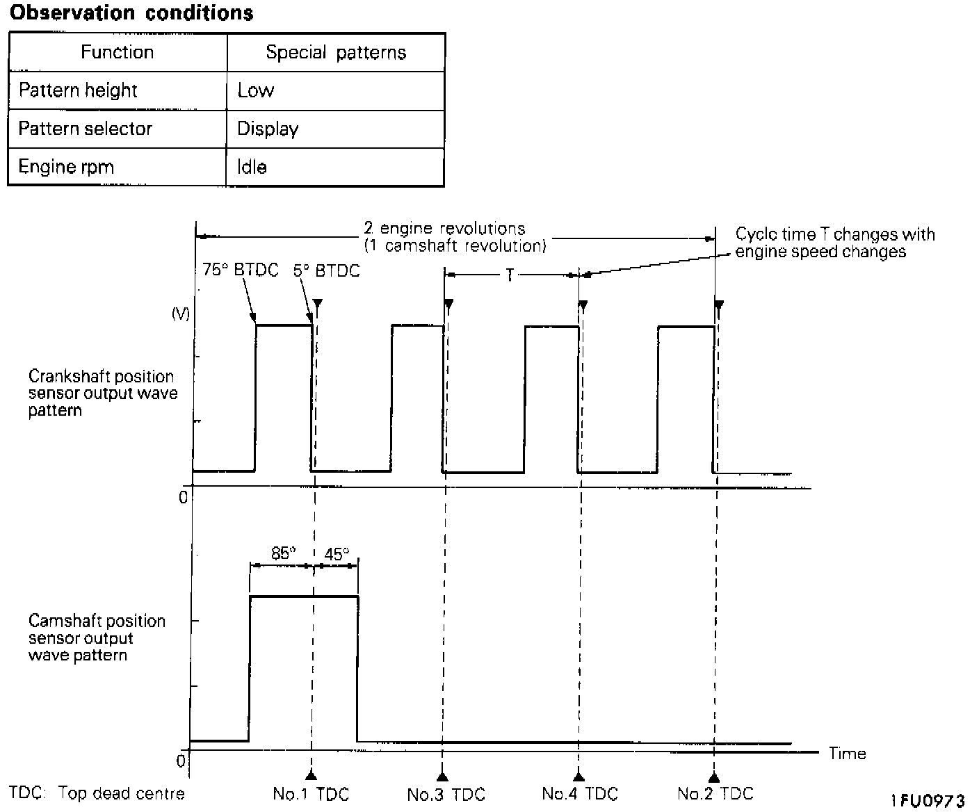 Wave pattern observation points: Check to be sure that cycle time T becomes shorter when the engine speed increases.