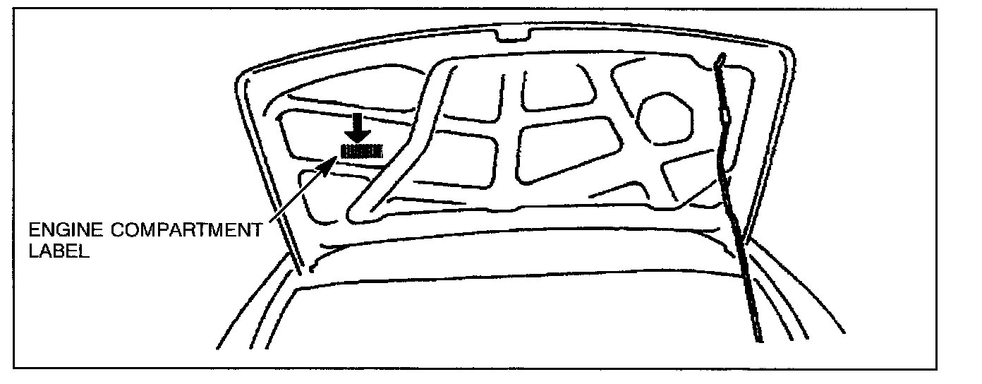 14. Carefully remove all dirt and oil from the vacant area shown on the underside of the hood. Affix the Engine Compartment label in the area shown.