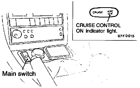2. Check to be sure that the CRUISE CONTROL ON indicator light within the combination meter illuminates when the main switch is switched ON.
